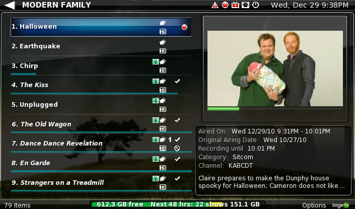 Not only does SageTV shows you watched status, but you can see how much you watched of a show, as seen below. The teal colored line at the bottom of each show title indicates the "watched" progress. I'm using the Diamond theme, so the check mark icons indicates "watched", and you can see other icons for currently recording (red dot), commercial skip (green/blue/green box), favorites (stars), HD, and first run airings (1). On the thumbnail, you can also see how much is currently recorded from the green bar. So there's lots of info right on the screen.