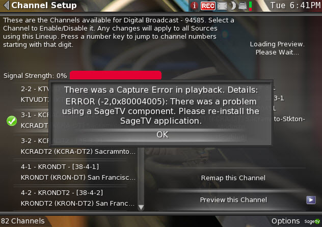 When I go to review the channel line up for the non-working tuners and select a channel to preview I get an error (see attached image). Any ideas what is going on? Thanks, Steve